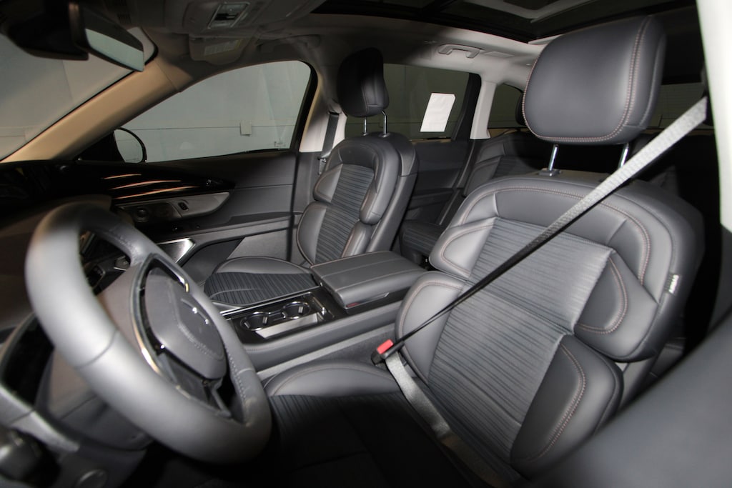 2.0L GTDI FHEV, 10 Speakers, 110V Power Converter, 4-Wheel Disc Brakes, ABS brakes, Adaptive suspension, Air Conditioning, Alloy wheels, AM/FM radio: SiriusXM with 360L, Apple CarPlay/Android Auto, Auto Air Refresh, Auto High-beam Headlights, Auto tilt-away steering wheel, Auto-dimming Rear-View mirror, Automatic temperature control, BlueCruise Equipped (4-Years Included), Brake assist, Bumpers: body-color, Compass, Delay-off headlights, Digital Scent, Driver door bin, Driver vanity mirror, Dual front impact airbags, Dual front side impact airbags, Electronic Stability Control, Emergency communication system: 911 Assist, Equipment Group 203A Reserve III, Exterior Parking Camera Rear, Four wheel independent suspension, Front anti-roll bar, Front Bucket Seats, Front Center Armrest w/Storage, Front dual zone A/C, Front reading lights, Fully automatic headlights, Garage door transmitter, Hands-Free Power Liftgate, Heated door mirrors, Heated front seats, Heated steering wheel, Illuminated entry, Knee airbag, Leather steering wheel, Lincoln Connectivity Package, Lincoln Digital Experience, Low tire pressure warning, Memory seat, Navigation System, Occupant sensing airbag, Outside temperature display, Overhead airbag, Overhead console, Panic alarm, Panoramic Vista Roof with Powershade, Passenger door bin, Passenger vanity mirror, Power door mirrors, Power driver seat, Power Liftgate, Power passenger seat, Power steering, Power windows, Premium Leather Trimmed Captain's Chairs, Premium Leather-Trimmed Heated/Ventilated Captain's Chairs, Radio data system, Radio: AM/FM Revel Audio System, Radio: AM/FM Revel Ultima 3D Audio System, Rain sensing wipers, Rear anti-roll bar, Rear Heated Seats with Switch Control, Rear reading lights, Rear seat center armrest, Rear window defroster, Rear window wiper, Remote keyless entry, Security system, SiriusXM with 360L, Speed control, Speed-sensing steering, Speed-Sensitive Wipers, Split folding rear seat, Spoiler, Steering wheel memory, Steering wheel mounted audio controls, Tachometer, Telescoping steering wheel, Tilt steering wheel, Traction control, Trip computer, Turn signal indicator mirrors, Variably intermittent wipers, Ventilated front seats, Wheels: 21 Bright Machined Aluminum, 2.0L GTDI FHEV.
