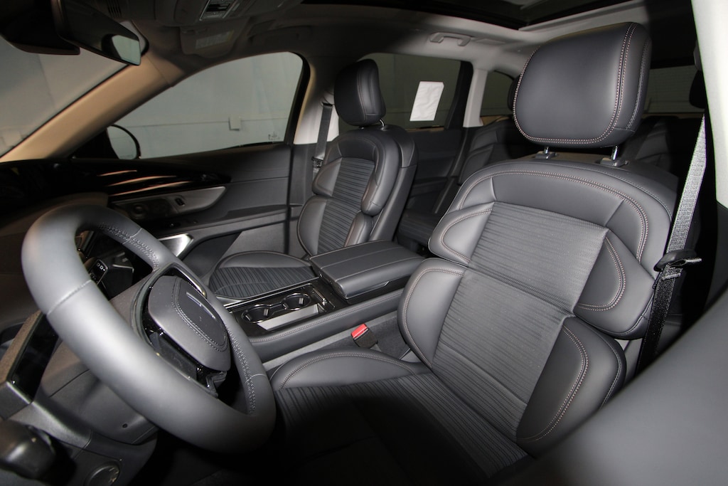 2.0L GTDI FHEV, 10 Speakers, 110V Power Converter, 4-Wheel Disc Brakes, ABS brakes, Adaptive suspension, Air Conditioning, Alloy wheels, AM/FM radio: SiriusXM with 360L, Apple CarPlay/Android Auto, Auto Air Refresh, Auto High-beam Headlights, Auto tilt-away steering wheel, Auto-dimming Rear-View mirror, Automatic temperature control, Black Exterior Elements, BlueCruise Equipped (4-Years Included), Body-Color Exterior Elements, Brake assist, Bumpers: body-color, Compass, Delay-off headlights, Digital Scent, Driver door bin, Driver vanity mirror, Dual front impact airbags, Dual front side impact airbags, Electronic Stability Control, Emergency communication system: 911 Assist, Equipment Group 203A Reserve III, Exterior Parking Camera Rear, Four wheel independent suspension, Front anti-roll bar, Front Bucket Seats, Front Center Armrest w/Storage, Front dual zone A/C, Front reading lights, Fully automatic headlights, Garage door transmitter, Hands-Free Power Liftgate, Heated door mirrors, Heated front seats, Heated steering wheel, Illuminated entry, Jet Appearance Package, Knee airbag, Leather steering wheel, Lincoln Connectivity Package, Lincoln Digital Experience, Low tire pressure warning, Memory seat, Navigation System, Occupant sensing airbag, Outside temperature display, Overhead airbag, Overhead console, Panic alarm, Panoramic Vista Roof with Powershade, Passenger door bin, Passenger vanity mirror, Power door mirrors, Power driver seat, Power Liftgate, Power passenger seat, Power steering, Power windows, Premium Leather Trimmed Captain's Chairs, Premium Leather-Trimmed Heated/Ventilated Captain's Chairs, Radio data system, Radio: AM/FM Revel Audio System, Radio: AM/FM Revel Ultima 3D Audio System, Rain sensing wipers, Rear anti-roll bar, Rear Heated Seats with Switch Control, Rear reading lights, Rear seat center armrest, Rear window defroster, Rear window wiper, Remote keyless entry, Security system, SiriusXM with 360L, Speed control, Speed-sensing steering, Speed-Sensitive Wipers, Split folding rear seat, Spoiler, Steering wheel memory, Steering wheel mounted audio controls, Tachometer, Telescoping steering wheel, Tilt steering wheel, Traction control, Trip computer, Turn signal indicator mirrors, Variably intermittent wipers, Ventilated front seats, Wheels: : 22 Satin Dark Luster Aluminum, 2.0L GTDI FHEV.