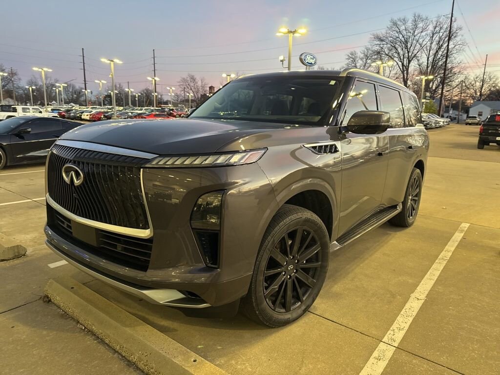 2025 INFINITI QX80 LUXE Recent Arrival! We want you to shop confidently for your next used car at The BIG Ford Store, D-Patrick Ford. We are located on Highway 41 and Walnut in Evansville, right next to the Lloyd Expressway. Buy this used vehicle 100% online or in-store. This pre-owned vehicle was put through an extensive inspection before hitting our lot. Because of this, we are able to offer a 3-month/3,000-mile comprehensive limited warranty. You also get our Love It or Return It 5-day, 300-mile Exchange Policy. See our website for more details on both. We also offer extended service plans, vehicle protection plans, and offer a free to you CarFax vehicle history report. *Prices listed do not include a $250 documentation fee, applicable tax, title, tags, license, or $195 service and preparation. All pricing, vehicle information, and features (such as accessories and color) are believed to be accurate, but we do not warrant or guarantee such accuracy. The prices shown above may vary from region to region, and incentives are subject to change. Some offers listed may not be available to all customers. All online sale commitments are subject to confirmation of continued availability of vehicle. Once availability is confirmed, online sale agreement becomes binding upon the parties. If any information found on the website is thought to be erroneous, please verify information with a customer service representative. See dealer for full details. Looking to sell your current vehicle? We buy cars for cash. Every test drive at D-Patrick Ford in Evansville earns $10 to a local charity. Schedule your test drive today! 14 Speakers, 3rd row seats: bench, 4-Wheel Disc Brakes, ABS brakes, Adaptive suspension, Air Conditioning, Alloy wheels, AM/FM radio: SiriusXM with 360L, Anti-whiplash front head restraints, Apple CarPlay/Android Auto, Audio memory, Auto High-beam Headlights, Auto tilt-away steering wheel, Auto-dimming door mirrors, Auto-dimming Rear-View mirror, Auto-leveling suspension, Automatic temperature control, Brake assist, Bumpers: body-color, Center Front Spoiler, Climate Controlled Front Bucket Seats, Compass, Delay-off headlights, Driver door bin, Driver vanity mirror, Dual front impact airbags, Dual front side impact airbags, Electronic Stability Control, Emergency communication system: INFINITI InTouch, Four wheel independent suspension, Front anti-roll bar, Front Bucket Seats, Front Center Armrest, Front dual zone A/C, Front reading lights, Fully automatic headlights, Garage door transmitter: myQ Connected Garage, Heads-Up Display, Heated door mirrors, Heated front seats, Heated rear seats, Heated steering wheel, HVAC memory, Illuminated entry, Knee airbag, Leather Seating Surfaces, Leather steering wheel, Literature Kit, Low tire pressure warning, Memory seat, Navigation system: Google Built-in, Occupant sensing airbag, Outside temperature display, Overhead airbag, Overhead console, Panic alarm, Passenger door bin, Passenger vanity mirror, Power door mirrors, Power driver seat, Power Liftgate, Power moonroof, Power passenger seat, Power steering, Power windows, Premium Paint, Radiant Front & Rear Doors Illuminated Kick Plates, Radio data system, Radio: Klipsch Premium Audio System w/14 Speakers, Rain sensing wipers, Rear air conditioning, Rear anti-roll bar, Rear reading lights, Rear seat center armrest, Rear window defroster, Rear window wiper, Reclining 3rd row seat, Remote keyless entry, Security system, Speed control, Speed-sensing steering, Split folding rear seat, Spoiler, Steering wheel memory, Steering wheel mounted audio controls, Tachometer, Telescoping steering wheel, Tilt steering wheel, Traction control, Trip computer, Turn signal indicator mirrors, Variably intermittent wipers, Ventilated front seats, Ventilated rear seats, Wheels: 22" x 8" Cast Aluminum Alloy. CARFAX One-Owner. 4D Sport Utility LUXE 9-Speed Automatic 3.5L V6 DOHC 24V 4WD Anthracite Gray CALL TODAY (812) 625-4823 OR SHOP ONLINE AT WWW.DPATRICKF