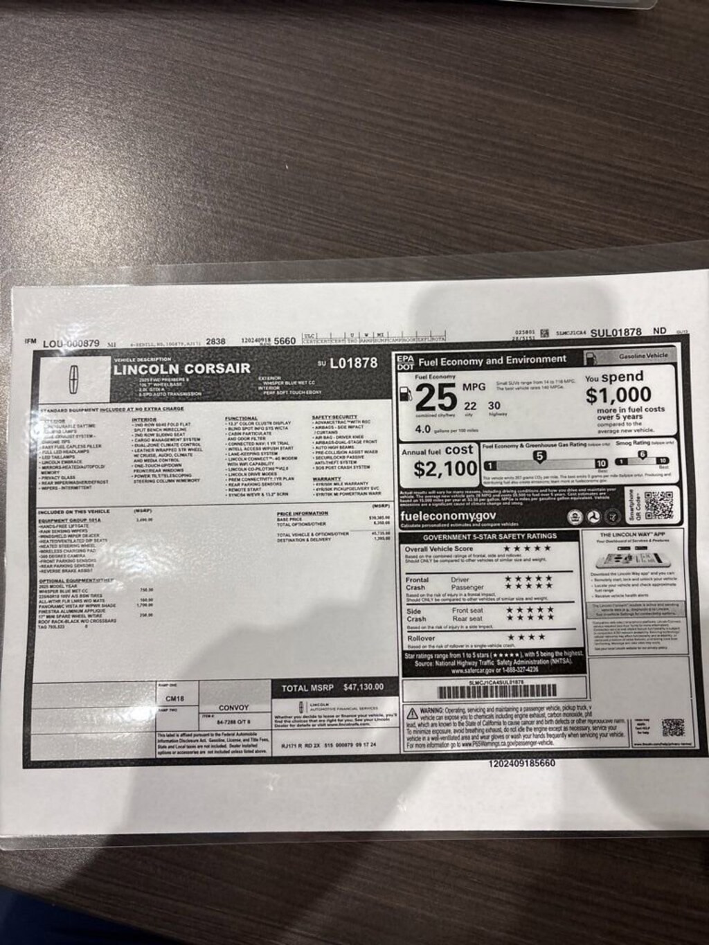 2025 Lincoln Corsair Premiere Recent Arrival! We want you to shop confidently for your next used car at The BIG Ford Store, D-Patrick Ford. We are located on Highway 41 and Walnut in Evansville, right next to the Lloyd Expressway. Buy this used vehicle 100% online or in-store. This pre-owned vehicle was put through an extensive inspection before hitting our lot. Because of this, we are able to offer a 3-month/3,000-mile comprehensive limited warranty. You also get our Love It or Return It 5-day, 300-mile Exchange Policy. See our website for more details on both. We also offer extended service plans, vehicle protection plans, and offer a free to you CarFax vehicle history report. *Prices listed do not include a $250 documentation fee, applicable tax, title, tags, license, or $195 service and preparation. All pricing, vehicle information, and features (such as accessories and color) are believed to be accurate, but we do not warrant or guarantee such accuracy. The prices shown above may vary from region to region, and incentives are subject to change. Some offers listed may not be available to all customers. All online sale commitments are subject to confirmation of continued availability of vehicle. Once availability is confirmed, online sale agreement becomes binding upon the parties. If any information found on the website is thought to be erroneous, please verify information with a customer service representative. See dealer for full details. Looking to sell your current vehicle? We buy cars for cash. Every test drive at D-Patrick Ford in Evansville earns $10 to a local charity. Schedule your test drive today! 18" Bright Machined Aluminum Wheels, 2 Additional USB Ports in Rear of Center Console, 360-Degree Camera, 4-Wheel Disc Brakes, 60/40 EasyFold Rear Seat w/Power Seatback Release, 9 Speakers, ABS brakes, Air Conditioning, Alexa Built-In, All-Weather Floor Liners, Alloy wheels, AM/FM radio: SiriusXM with 360L, Apple CarPlay/Android Auto, Auto High-beam Headlights, Auto-dimming Rear-View mirror, Automatic temperature control, Black Roof Rack Side Rails, Brake assist, Bumpers: body-color, Compass, Delay-off headlights, Driver door bin, Driver vanity mirror, Dual front impact airbags, Dual front side impact airbags, Electronic Stability Control, Emergency communication system: 911 Assist, Equipment Group 101A, Four wheel independent suspension, Frameless Auto Dimming Rearview Mirror, Front anti-roll bar, Front Bucket Seats, Front Center Armrest, Front dual zone A/C, Front Parking Sensors, Front reading lights, Fully automatic headlights, Hands-Free Liftgate, Heated door mirrors, Heated front seats, Heated Sideview Mirrors, Heated Steering Wheel, Heated/Ventilated Driver & Front Passenger Seats, Illuminated entry, Knee airbag, Leather steering wheel, Lincoln Soft Touch Heated Front Captain's Chairs, Low tire pressure warning, Memory seat, Micro-Perf Lincoln Soft Touch Captain's Chairs, Navigation system: Connected Navigation (4-year trial), Occupant sensing airbag, Outside temperature display, Overhead airbag, Overhead console, Panic alarm, Panoramic Vista Roof w/Power Shade, Passenger door bin, Passenger vanity mirror, Phone As A Key (PAAK), Post-Collision Braking, Power door mirrors, Power driver seat, Power Liftgate, Power passenger seat, Power steering, Power Tilt/Telescoping Steering Column w/Memory, Power windows, Radio data system, Radio: Lincoln Premium Audio System w/MP3, Rain Sensing Wipers, Rear anti-roll bar, Rear Parking Sensors, Rear reading lights, Rear seat center armrest, Rear window defroster, Rear window wiper, Remote keyless entry, Reverse Brake Assist, Security system, SiriusXM w/360L Radio, Speed control, Speed-sensing steering, Speed-Sensitive Wipers, Split folding rear seat, Spoiler, Steering wheel mounted A/C controls, Steering wheel mounted audio controls, SYNC 4 Communications & Entertainment System, Tachometer, Telescoping steering wheel, Tilt steering wheel, Traction control, Trip computer, Univer
