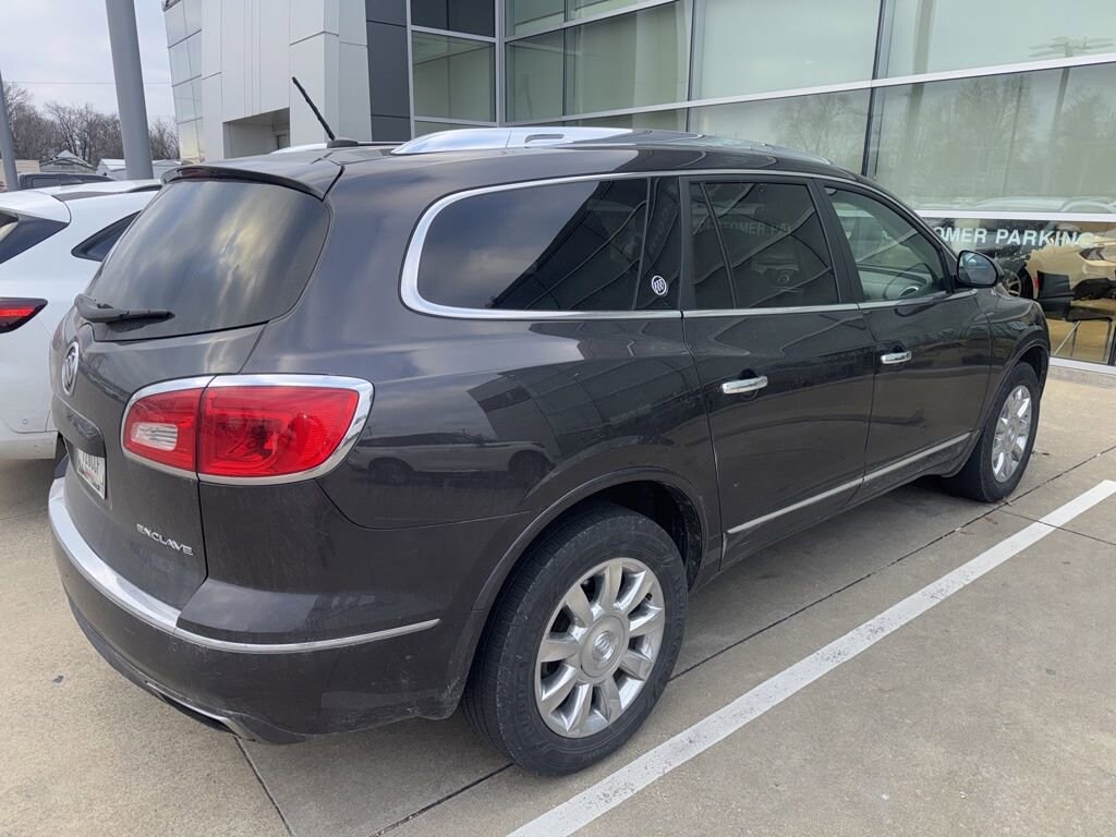 2015 Buick Enclave Leather Group Recent Arrival! VEHICLE SOLD AS-IS. We want you to shop confidently for your next used car at The BIG Ford Store, D-Patrick Ford. We are located on Highway 41 and Walnut in Evansville, right next to the Lloyd Expressway. This vehicleâs low price is reflective of its age, condition, and mileage and we do not warrant its mechanical or overall condition. This vehicle is provided with a free to you CarFax vehicle history report. This is an AS-IS vehicle and is not available for additional service plans. *Prices listed do not include a $250 documentation fee, applicable tax, title, tags, license, or $195 service and preparation. All pricing, vehicle information, and features (such as accessories and color) are believed to be accurate, but we do not warrant or guarantee such accuracy. The prices shown above may vary from region to region, and incentives are subject to change. Some offers listed may not be available to all customers. All online sale commitments are subject to confirmation of continued availability of vehicle. Once availability is confirmed, online sale agreement becomes binding upon the parties. If any information found on the website is thought to be erroneous, please verify information with a customer service representative. See dealer for full details. Looking to sell your current vehicle? We buy cars for cash. Every test drive at D-Patrick Ford in Evansville earns $10 to a local charity. Schedule your test drive today! FWD, 19" 9-Spoke Chrome-Clad Aluminum Wheels, 19" x 7.5" Aluminum (4) Wheels, 3.16 Axle Ratio, 3rd row seats: split-bench, 4-Wheel Disc Brakes, 6 Speakers, 7-Passenger Seating, 8-Way Power Driver Seat Adjuster, 8-Way Power Passenger Seat Adjuster, ABS brakes, Air Conditioning, Alloy wheels, AM/FM radio: SiriusXM, Auto-dimming Rear-View mirror, Automatic temperature control, Brake assist, Bumpers: body-color, CD player, Compass, Delay-off headlights, Driver door bin, Driver vanity mirror, Dual front impact airbags, Dual front side impact airbags, Electronic Stability Control, Emergency communication system: OnStar Directions & Connections, Exterior Parking Camera Rear, Four wheel independent suspension, Front anti-roll bar, Front Bucket Seats, Front Center Armrest w/Storage, Front dual zone A/C, Front reading lights, Fully automatic headlights, Garage door transmitter, Heated door mirrors, Heated Driver & Front Passenger Seats, Heated front seats, Heated Steering Wheel, Heated steering wheel, High intensity discharge headlights: Bi-Xenon, Illuminated entry, Leather steering wheel, Low tire pressure warning, Memory seat, Memory Settings, Occupant sensing airbag, Outside temperature display, Overhead airbag, Panic alarm, Passenger door bin, Passenger vanity mirror, Perforated Leather-Appointed Seat Trim, Power door mirrors, Power driver seat, Power Liftgate, Power passenger seat, Power steering, Power windows, Preferred Equipment Group 1SL, Radio data system, Radio: Color Touch AM/FM/CD w/IntelliLink, Rear air conditioning, Rear anti-roll bar, Rear Parking Sensors, Rear reading lights, Rear window defroster, Rear window wiper, Remote keyless entry, Roof rack: rails only, Security system, Side Blind Zone Alert w/Cross Traffic Alert, SiriusXM Satellite Radio, Speed control, Speed-sensing steering, Spoiler, Steering wheel mounted audio controls, Tachometer, Telescoping steering wheel, Tilt steering wheel, Traction control, Trip computer, Turn signal indicator mirrors, Variably intermittent wipers, Voltmeter, FWD. CARFAX One-Owner. Clean CARFAX. 4D Sport Utility Leather Group 6-Speed Automatic Electronic with Overdrive 3.6L V6 SIDI VVT FWD Iridium Metallic CALL TODAY (812) 625-4823 OR SHOP ONLINE AT WWW.DPATRICKFORD.COM.